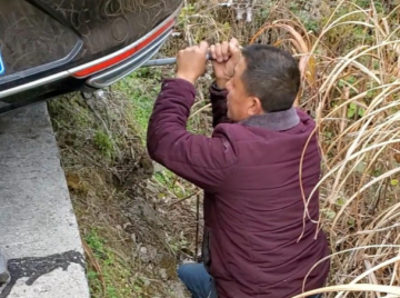 川藏線逶迤在橫斷山區(qū)和西藏高原的崇山之間,風(fēng)景非常美麗,但路況十分危險(xiǎn)。近日,一輛去西藏自駕的轎車在山路上行駛時(shí),右側(cè)后輪突然滑下路沿,本想著轟油門開上來,但車不僅沒上來還滑下去了一些。正當(dāng)車主手足無措時(shí)路過了一位村民,村民從車上拿下千斤頂和一段木板,將木板一端放在路上一端放在千斤頂上,然后用千斤頂將車輪抬起,千斤頂支起木板形成一個(gè)坡面,車主順著木板緩慢將車開回路上,得以脫困。