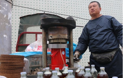 榨油的第一步就是準(zhǔn)備原料,油的原料多種多樣,可以是花生、油菜花籽、橄欖和向日葵等,不管是什么原料在準(zhǔn)備好以后都要進(jìn)行壓榨才能出油。壓榨時(shí)千斤頂下面是容納原料的容器,上面是固定用的鐵架,搖動(dòng)手柄,慢慢給原料施加壓力,這樣油就被壓榨出來。這樣制作的油里面不添加任何化學(xué)物質(zhì),深受人們的歡迎。以前古法榨油都是在油餅兩端人力增加木楔施加壓力,既費(fèi)時(shí)又費(fèi)力。現(xiàn)在使用機(jī)器以后既提高了效率又提高了產(chǎn)量。